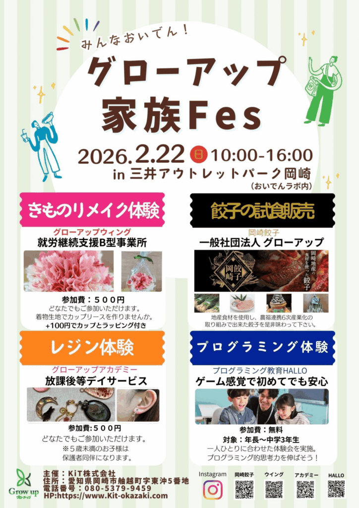 この度、三井アウトレットパーク岡崎(おいでんラボ内にて)グローアップ家族FESを開催します!